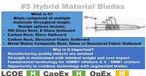 運(yùn)用混合材料的基本理念是在風(fēng)力渦輪片的不同受力點(diǎn)的地方采用不同質(zhì)量和密度的材料,這樣可以減少風(fēng)力渦輪片的總重量,同時加固風(fēng)力渦輪片的整體結(jié)構(gòu)。現(xiàn)有的案例包括運(yùn)用高模量玻璃或是碳纖維來制造渦輪片的網(wǎng)狀結(jié)構(gòu)和根部——這些地方的受力更多,同時用一般的玻璃來生產(chǎn)外部結(jié)構(gòu)。這樣一來可以節(jié)省成本,優(yōu)化現(xiàn)有的基礎(chǔ)設(shè)施,充分利用創(chuàng)新科技。