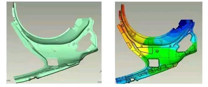 三維掃描系統能夠對汽車進行裝配檢測,尤其是使用傳統手段難以檢測的自由曲面更加有效。在對整車或者部件進行掃描后,導入專業質量檢測軟件進行尺寸檢測,生成的色差分析圖和誤差分析報告能夠更直觀了解誤差。這種自由曲面的三維檢測方式節省了人力和時間,讓制造商快速生產出精度高,質量可靠的汽車配件,滿足了客戶的需求。