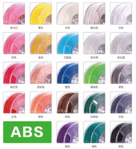 桌面機耗材主要有ABS和PLA,耗材均是直徑1.75mm的卷裝線材,單卷線材重量1kg。兩種材料均有20多種顏色可選擇,包括白色、乳白色、黃色、紅色、黑色、灰色、綠色、橙色等等 ABS :強度高、韌性好、易于加工成型的熱塑型高分子材料。 PLA :能生物降解外,生物相容性、光澤度、透明性、手感和耐熱性較好。